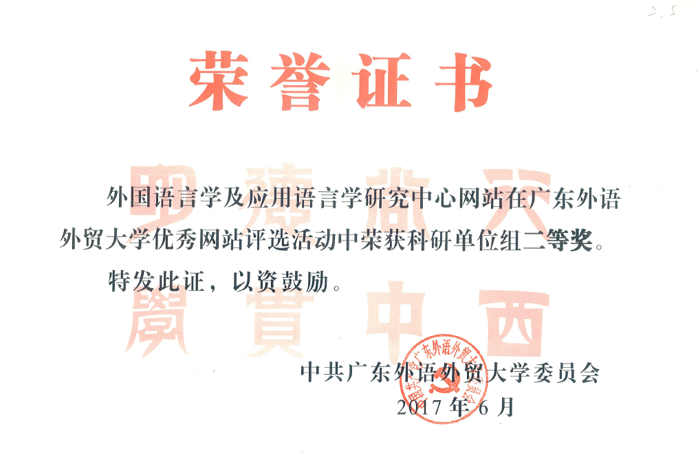 近日,我校发布了《关于公布优秀网站评选结果的通知》,本中心网站在广东外语外贸大学优秀网站评选活动中荣获科研单位组二等奖的荣誉。