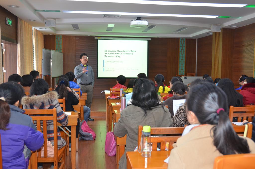 Two features characterized the talk: the extensive knowledge and experience of Dr. Gao and the relaxing atmosphere reflected in the free discussion between Dr. Gao and the attendants. The talk started with an exploration of the reasons of qualitative research, compared with quantitative endeavor relying on statistical analysis of large-scale data. Several dimensions of challenges were identified in analyzing and presenting qualitative findings. For example, lack of organization, subjective interpretation, descriptive narration and lack of significance. Dr. Gao then detailed some solutions for researchers in academic writing. The employment of a research resource map was, in particular, introduced and recommended by Dr. Gao in guiding and enhancing qualitative data analysis, for it could help broaden researchers’ vision into various contextual factors and processes surrounding the investigation in data collection and data analysis. Finally, he provided many examples to illustrate the application of the research resource map.
