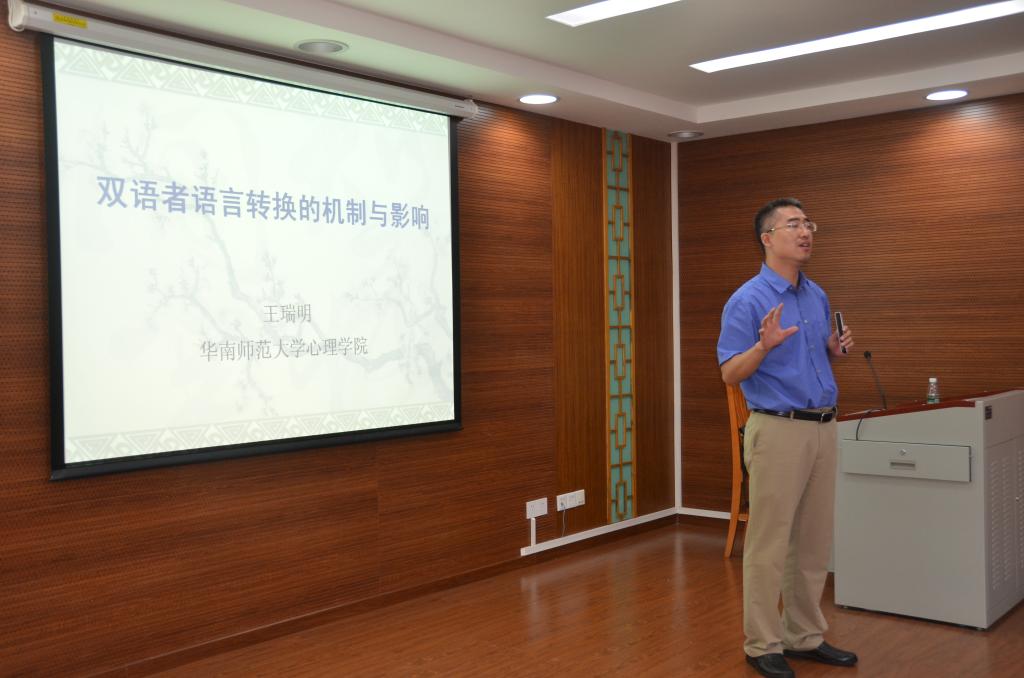 On the afternoon of May 29th, 2015, ProfessorRuiming Wang from South China Normal University was invited to deliver thelecture “The mechanism and impacts of bilingual language switching” at theNational Key Research Center for Linguistics and Applied Linguistics, GuangdongUniversity of Foreign Studies (GDUFS). Hosted by Professor Yanping Dong, the talk attracted teachers and students from GDUFS and other universities.
