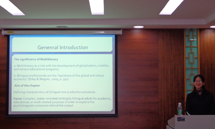 2013年3月15日晚,我中心脑与语言实验室举行本学期第二次专题研讨,参加人员是董燕萍教授、杨静副教授及各年级心理语言学博、硕士研究生。博士生火敬就我中心云山学者——李平教授的新作The Psycholinguistics of Bilingualism中“Chapter 5: Writing”一部分内容做了述评,并提出博士论文:The role of working memory in Chinese-English bilinguals’ writing process选题思路和实验设想。师生就述评内容进行了细节探讨,并对论文选题提出了建设性的意见和建议。研讨会通过问与答、疑与辩的形式分享心得,提出潜在研究方向,同时也指出现存的不足,为今后工作带来了新的动力。