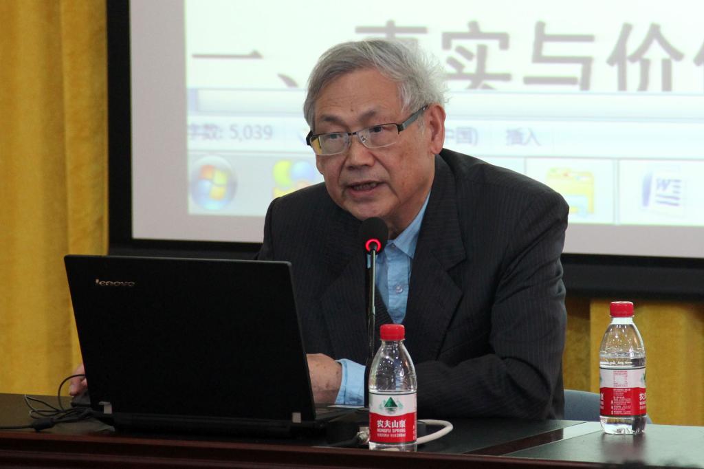 钱冠连首先发表了以“眼光、(语言)事实和价值——兼论学者的宁静心”为主旨的发言。其发言分三部分,分别为:事实与价值配对,语言哲学与语言研究,宁静心态:为研究、为写作、更为人生。钱冠连认为,对同一个事实,不同的眼光会发现不同的价值,什么样的眼光,决定了从事实中发现什么样的价值。钱冠连以索绪尔为例子解释了这个观点:“他(索绪尔)能发现语言事实中的价值,就是因为他有哲学眼光:不忘讨论存在、时间、事物、精神与意义等等。”