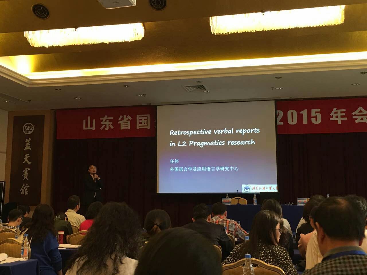 2015年10月16-18日,我中心专职研究员任伟教授应邀出席在山东省威海市举办的山东省国外语言学学会并做了题为 “Retrospective verbal reports in L2 Pragmatics research”的大会主旨发言。