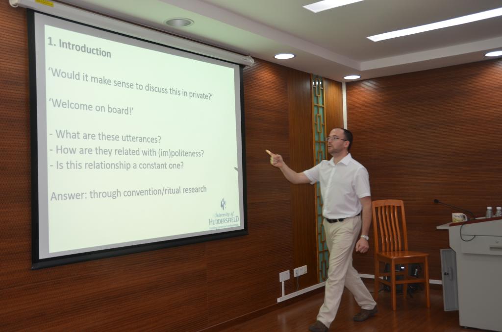 2015年10月20日下午,我校云山讲座教授Daniel Kadar 在我中心做了题为“Politeness, Convention and Ritual”的第二场学术讲座,报告吸引校内外五十余名教师、博士生及硕士研究生前来参加。