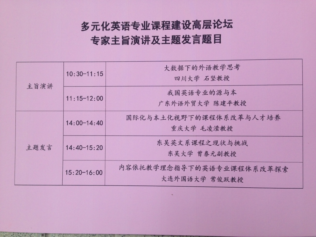 论坛邀请了四川大学石坚教授做题为“大数据下的外语教学思考”和广东外语外贸大学外国语言学及应用语言学研究中心陈建平教授做题为“我国英语专业的源与本”主旨报告。东吴大学英文系主任曾泰元教授、大连外国语大学英语学院院长常俊跃教授和重庆大学毛凌滢教授在论坛上做了主题发言。国内高校外语学院院长、英语系主任等代表参加了本次论坛。