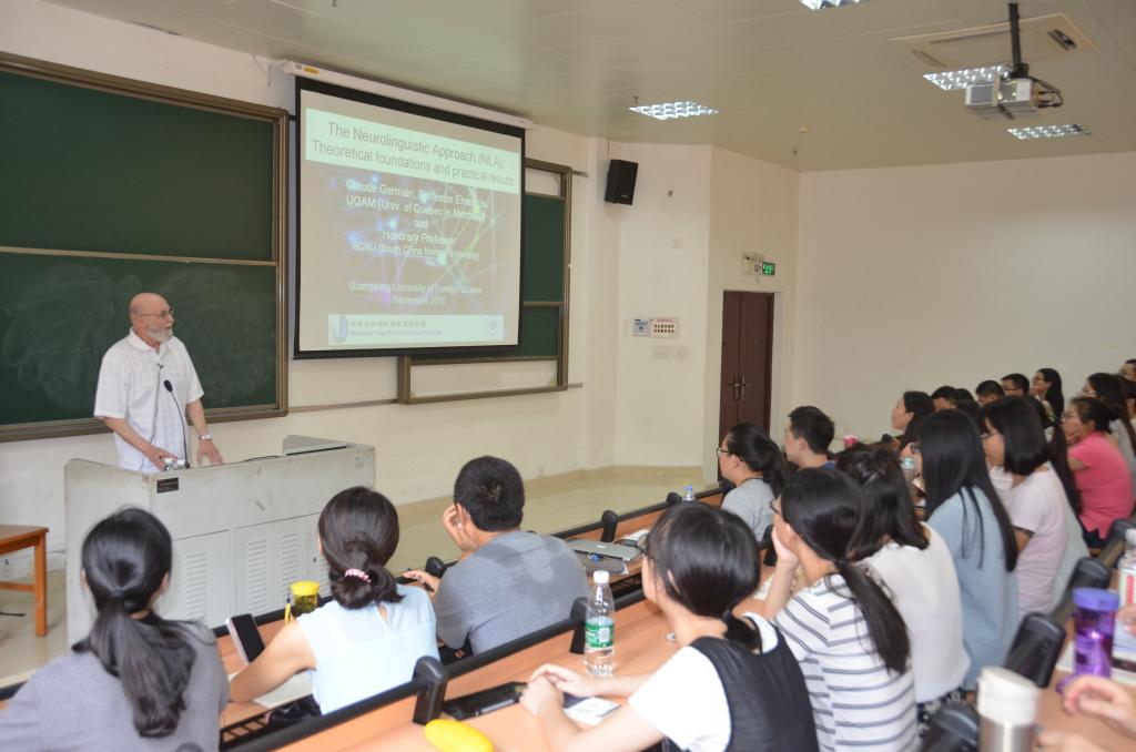 2016年9月28号下午在第七教学楼213,加拿大籍客座教授,渥太华大学博士,魁北克大学蒙特利尔分校语言学及语言教学法系终身教授、博导Claude Germain教授应邀为广外师生、访问学者作了题为“神经语言学教学法:理论、技能及结果”的讲座。在讲座中,Germain教授首先介绍神经语言学教学法的理论基础。其次,他通过一些课堂视频展示在不同国家的课堂中教授法语时,神经语言学教学法的具体做法。最后,他详细介绍2011-2013年在华师进行的神经语言学教学法的结果:与传统教学法相比,发现华师的学生表现更为出众,这说明认知神经科学的基础研究成果可以有效地应用于课堂二语教学。