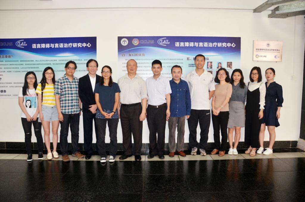 2017年4月20日上午,我中心院级研究机构“语言障碍与言语治疗研究中心”揭牌仪式在北校区第八教学楼一楼举行。出席揭牌仪式的领导和嘉宾有广东省外语研究与语言服务协同创新中心副主任葛诗利教授、秘书何静老师,香港理工大学言语治疗所负责人梁文德博士及其团队成员刘启欣博士、邓宝仪老师,我中心副主任徐海教授,语言障碍与言语治疗研究中心负责人石定栩教授及研究中心成员何晓炜教授、李颖卉博士。我中心部分博士生及硕士生也参加了揭牌仪式。