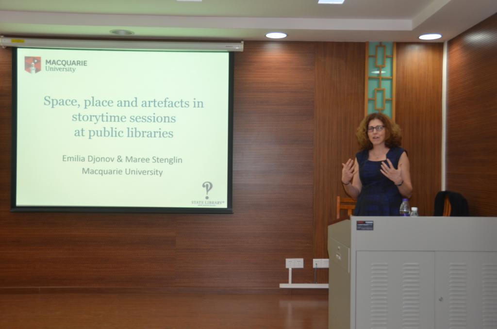 2018年3月22日下午,澳大利亚麦考瑞大学 Emilia Djonov博士在中心演示厅做了题为《公共图书馆故事分享环节中的空间,活动场地和使用的物品 》(Space, place and artefacts in storytime sessions at public libraries)的讲座。讲座由中心专职研究员张艺琼博士主持,吸引了校内外众多有志于从事社会学符号学、系统功能语言学、多模态分析等理论和应用研究的学者、教师和研究生。Djonov博士介绍了她和Maree Stenglin博士合作运用社会学符号学、系统功能语言学、多模态分析等理论和方法帮助澳大利亚新南威尔士州的图书馆系统建立评估图书馆故事分享环节的理论框架。该研究展示了语言学服务社会需求和提高学科社会影响力的可能途径之一。