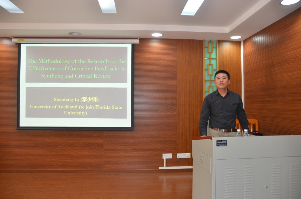 2018年5月11日上午,我校云山讲座教授、新西兰奥克兰大学李少锋博士在我中心演示厅做本期系列讲座第二讲:“综论纠错反馈效果的研究方法”。讲座由中心副主任徐海教授主持,张艺琼副教授等教师出席,多名博、硕士生及访问学者参加。
