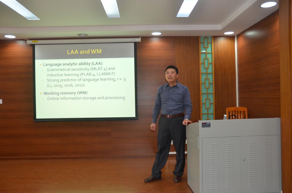 5月15日下午,我校云山讲座教授李少锋博士在我中心演示厅进行本期系列讲座第四讲:“The Associations Between Cognitive Ability and L2 Development under Five Different Instructional Conditions”(在5种不同的教学方式下认知学能与二语发展的关联)。讲座由中心副主任徐海教授主持,任伟教授出席,多名硕博研究生参加。