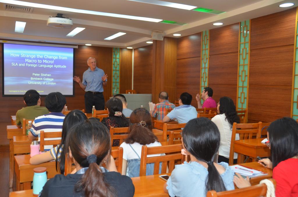 5月25日上午,伦敦大学Peter Skehan教授在我中心演示厅带来系列讲座第五讲“ How Strange the Change from Macro to Micro: On te relevance of second language acquisition for the development of foreign language aptitude tests”(宏观到微观的视角转变:二语习得与外语学能)。讲座由我中心专职研究员任伟教授主持,我中心专职研究员张艺琼博士、我校双语认知与发展实验室李金辉博士等教师出席,来自校内外的多名硕博士研究生参加了讲座。本次讲座是Skehan教授本次系列讲座的最后一讲, Skehan教授的多名学生相继从香港、澳门赶来参加了本场讲座。