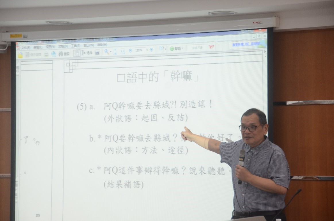 2019年11月11日上午,台湾清华大学语言学研究所教授,现任台湾语言学学会理事长蔡维天(Dylan Tsai)教授做客广东外语外贸大学著名教授论坛第428讲,做了题为“语法教学、汉语类型与制图分析”的专题讲座。讲座由我中心杨洋老师主持,我校石定栩教授、何晓炜教授、张庆文教授、冯光武教授、李金辉老师、陈哲老师、香港中文大学的潘俊楠教授和香港城市大学的罗振南教授以及来自我校及香港中文大学、中山大学等高校的师生参加了此次讲座及后续讨论。
