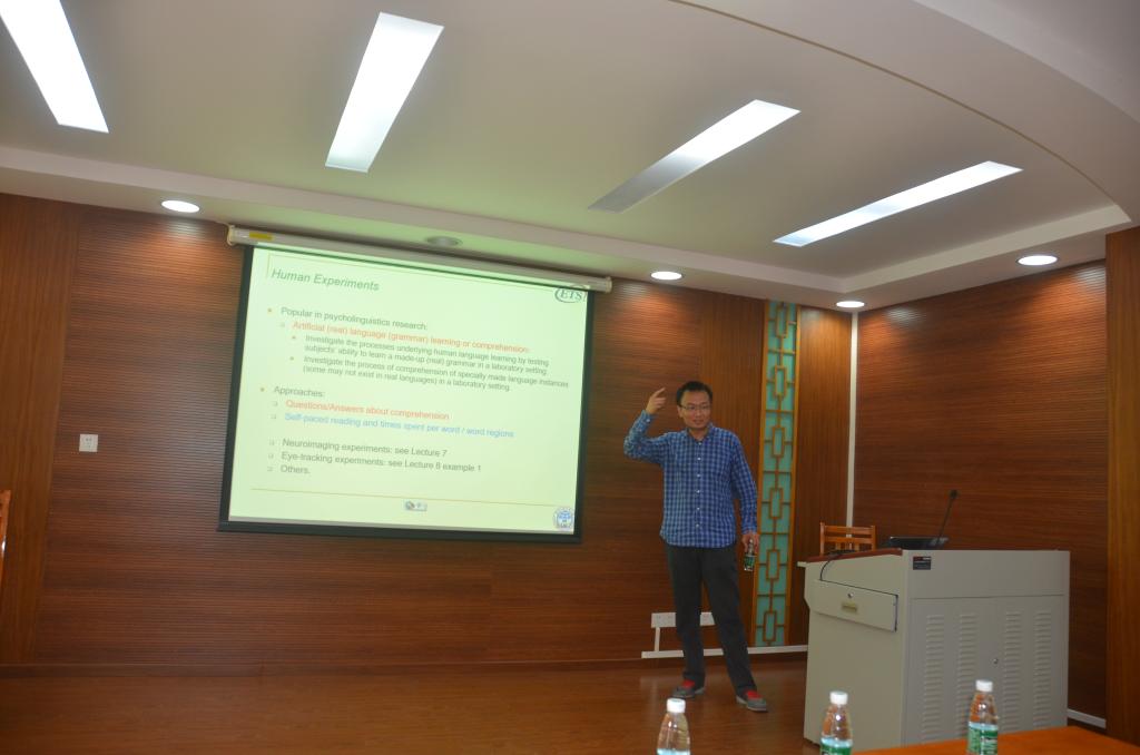 2019年11月13日上午,云山讲座教授龚涛博士在文科基地演示厅为我们带来了他的系列讲座第二讲。继上一讲《行为实验研究语言处理I》中所介绍的人工语言(artificial language(实验研究范式,本次讲座侧重于对自然语言(natural language(进行实验设计的研究,重点介绍了其近期实验研究中所探讨的1)汉语母语者对汉语句子中多个反身代词“自己”的解读倾向;2)汉语母语者对非标准化量词的句法和语义接受程度。