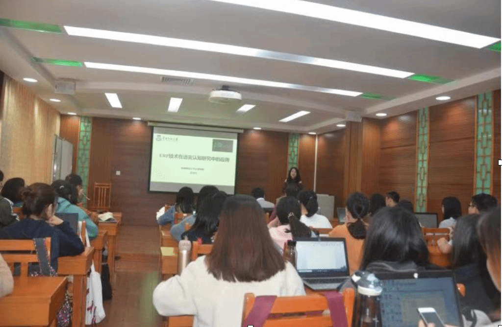 此次讲座首先介绍ERP的基本原理,ERP(事件相关电位)技术为当前语言认知研究常用的实验手段,时间分辨率较高,可实时测量出认知加工中更为精细准确的阶段性过程,研究脑内的有意识或无意识加工机理;然后介绍语言认知研究中的常用ERP成分,以ERP中波形图的波幅、峰值潜伏期以及脑电地形图中头皮分布等特征,界定了以下认知加工的成分:矢匹配负波(Mismatch Negativity, MMN)(可用于考察语音或视觉刺激的无意识加工),P600(多与句法加工有关,句法违反或句法歧义时出现),N400(句尾歧义,相关和无关词,新词与旧词等会诱发)。