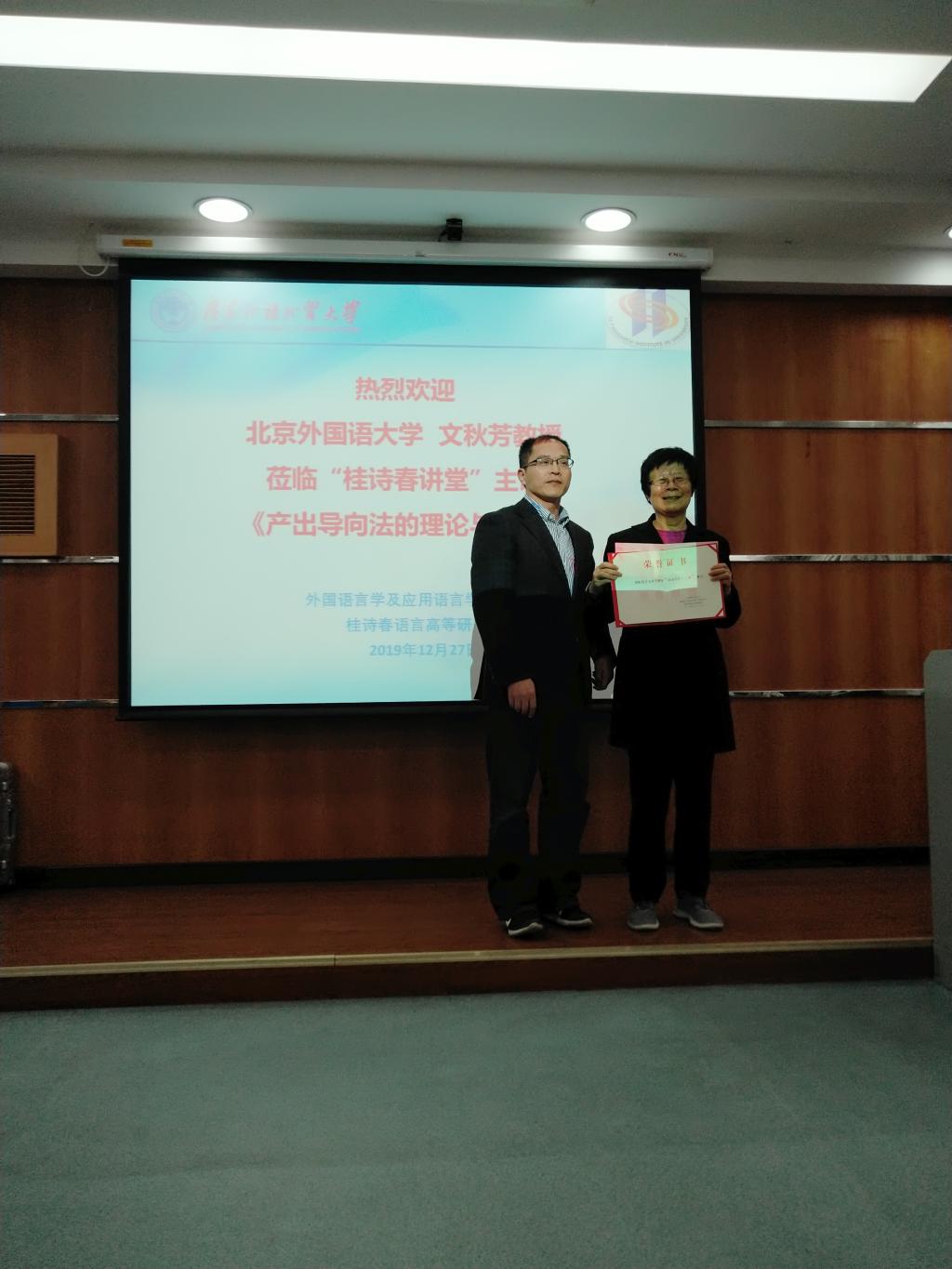 最后,外国语言学及应用语言学研究中心主任兼桂诗春语言高等研究院院长冉永平向文秋芳教授赠“桂诗春讲堂”证书,并真诚感谢文教授莅临我校主讲最新版的“产出导向法的理论与应用”,勉励大家继续学习文教授的治学精神和诲人不倦精神。