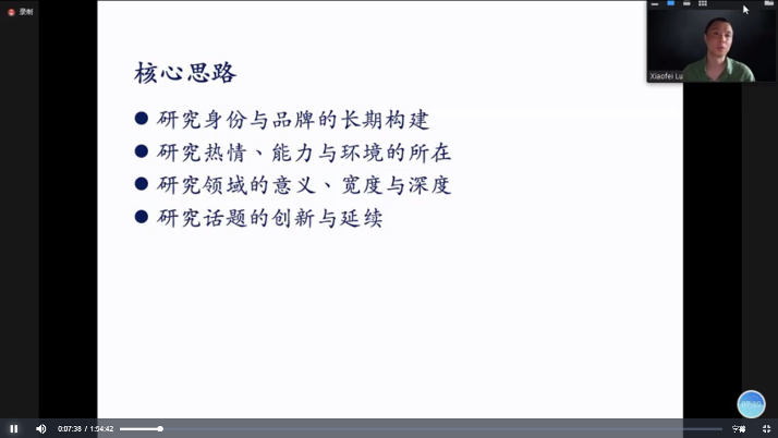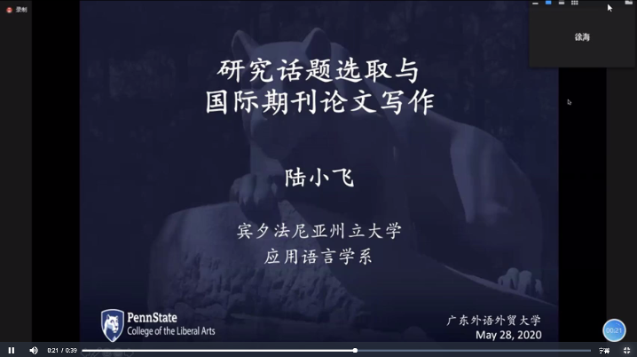 2020年5月28日晚8到10点,美国宾夕法尼亚州立大学应用语言学系研究生部主任陆小飞教授应邀主讲线上讲座“研究话题选取与国际期刊写作”。讲座由外国语言学及应用语言学研究中心副主任徐海教授主持,校内外听众多达500人。