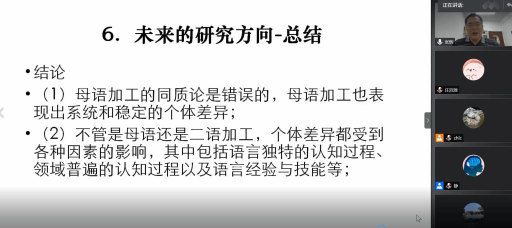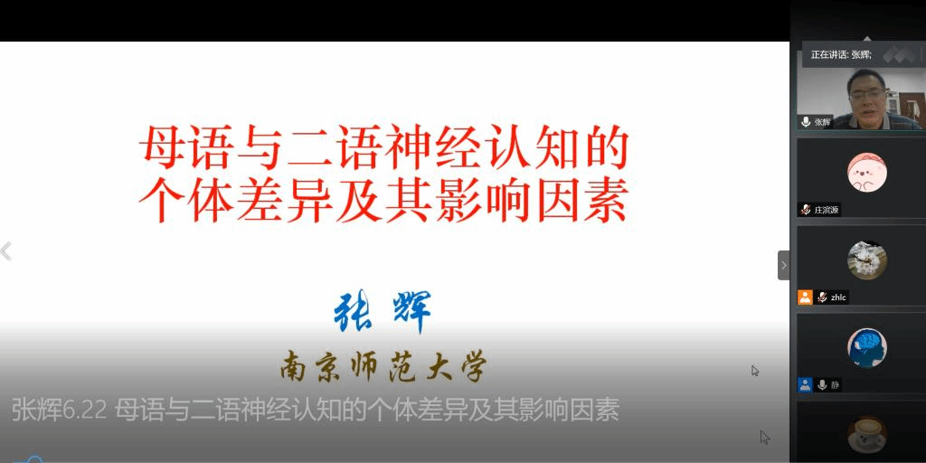 2020年6月22日15:30,南京师范大学特聘教授,博士生导师张辉教授应双语认知与发展实验室邀请进行线上讲座“母语与二语神经认知的个体差异及其影响因素”。讲座由赵晨教授主持,近300位校内外专家学者与硕博士研究生参加了此次讲座。