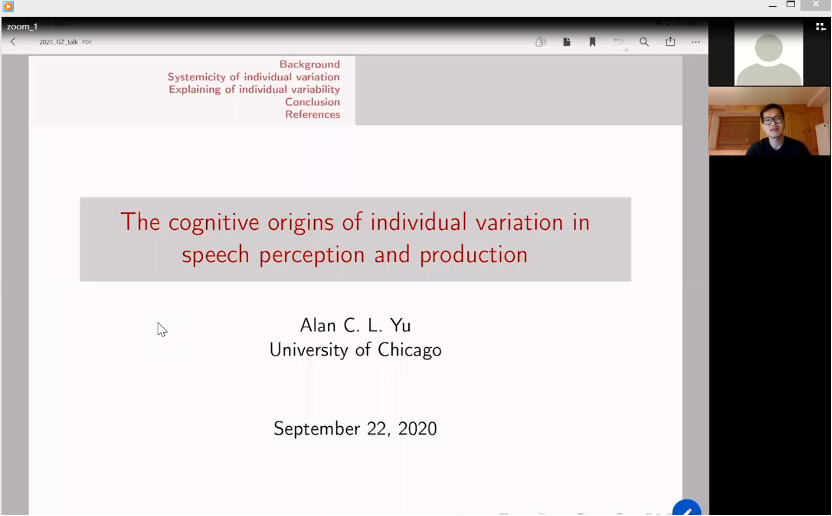 2020年9月23日上午10点,芝加哥大学语言学系Alan Yu教授应双语认知与发展实验室邀请做客外国语言学及应用语言学研究中心论坛,为广外师生带了一场题为“The cognitive origins of individual variation in speech perception and production”的主题报告。此次论坛采用线上Zoom会议模式,讲座由林洁绚博士主持。我中心专兼职研究员及校内外近110名师生在线参加了本次讲座。