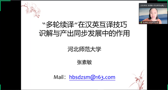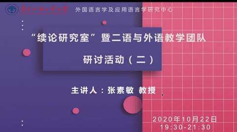 2020年10月22日晚七点半到九点半,中心“续论研究室” 暨二语与外语教学团队举行第二次线上研讨活动。主讲嘉宾河北师范大学张素敏教授做了题为《“多轮续译”在汉英互译技巧识解与产出同步发展中的作用》的讲座。讲座由许琪博士主持,王初明教授和续论研究团队成员等一百多位校内外专家学者及硕博士研究生参加了此次讲座。