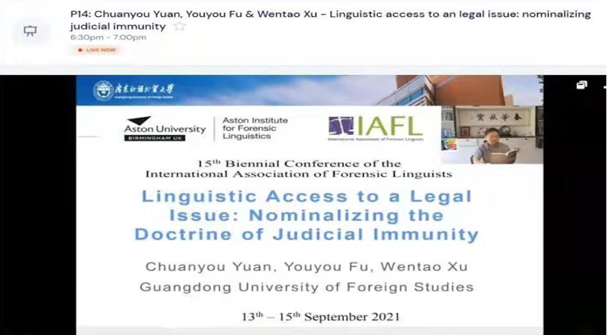 2021年9月13日至15日,第十五届国际法律语言学大会(IAFL15)通过线上平台顺利召开,大会主题涵盖法律语言学众多领域。本次会议由国际法律语言家协会(International Association of Forensic Linguists, 简称“IAFL”)主办,由英国伯明翰阿斯顿大学的阿斯顿法律语言学研究院(AIFL)承办。来自英国、美国、澳大利亚、中国、南非、德国、荷兰、西班牙、意大利、巴西、丹麦、葡萄牙、芬兰、挪威、奥地利、加拿大、罗马尼亚、埃及、菲律宾、印度尼西亚、泰国、香港等22个国家和地区的112名代表出席了本次线上会议。我中心研究员袁传有教授及法律语言学方向的博士研究生罗兴、付悠悠和许文涛,我校法律语言学研究团队的徐优平、张少敏博士率领多位硕士研究生参加了此次学术盛会。20名广外师生组成了庞大的广外代表团,在本次会议上分享了中国的法律语言学研究成果,彰显了广外的研究力量。
