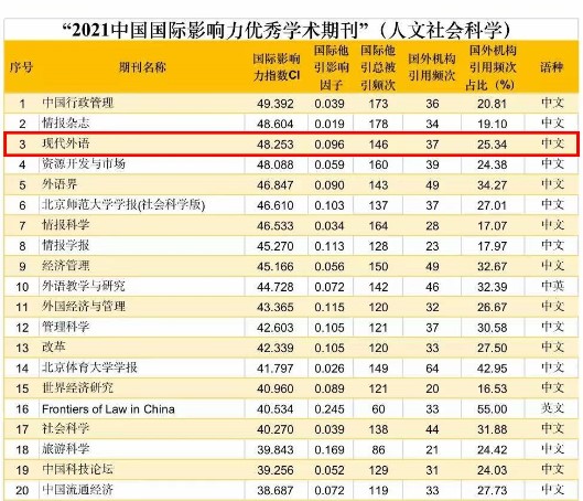 根据最新的《中国学术期刊国际引证年报》,由我校主办、教育部人文社科重点研究基地外国语言学及应用语言学研究中心承办的学术期刊《现代外语》再次成为“中国国际影响力优秀期刊”。在人文社会科学的所有期刊中,《现代外语》的国际影响力排位第三,体现了本刊的学术影响力。