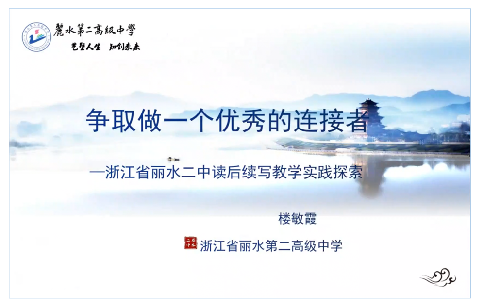 在经验分享环节,第一位分享的楼敏霞老师以“争做一个优秀的连接者——浙江省丽水二中读后续写教学实践探索”为题,分享了高中英语读后续写教学实践的成果。楼老师及其课题组以丽水二中英语成绩中等的高中生为对象,进行了读后续写教学实践,深入探究如何促进更多协同效应的发生。楼老师表示,教师应该从时空转换用语的选用和心绪变化语言素材的积累两方面入手,为学生的续写搭建语言支架。