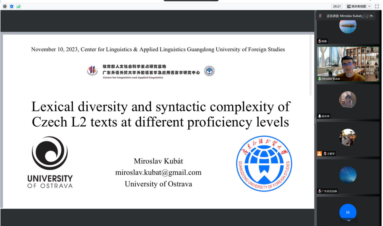 2022年11月10日晚上7点,捷克奥斯特拉瓦大学Kubát博士做客广东外语外贸大学外国语言学及应用语言学研究中心论坛,为广外师生带了一场题为“The lexical diversity and syntactic complexity of Czech L2 texts at different proficiency levels”的主题报告。此次论坛为外国语言学及应用语言学研究中心计算与计量语言学研究团队系列讲座之八。会议采用线上腾讯会议模式,讲座由王雅琴博士主持,团队成员陈衡副教授及校内外百余名专家学者和师生在线参加了本次讲座。