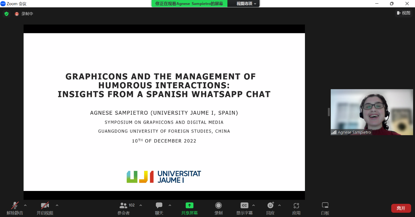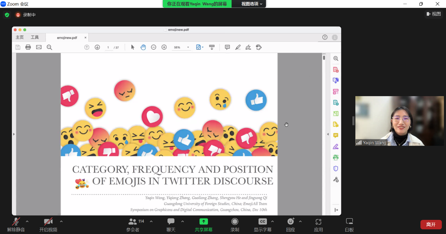2022年12月10日下午,广东外语外贸大学外国语言学及应用语言学研究中心在Zoom会议上成功举办“图文字与数字媒体”国际研讨会(Symposium on Graphicons and Digital Media)的上半场会议。该国际研讨会的下半场会议将于2023年1月14日举行。会议吸引了国内外近三百名学者的关注与参与,包括来自美国、加拿大、英国、德国、丹麦、澳大利亚、新加坡、荷兰、日本、马来西亚等地区的学者,为图文字研究提供了重要的国际学术交流平台。