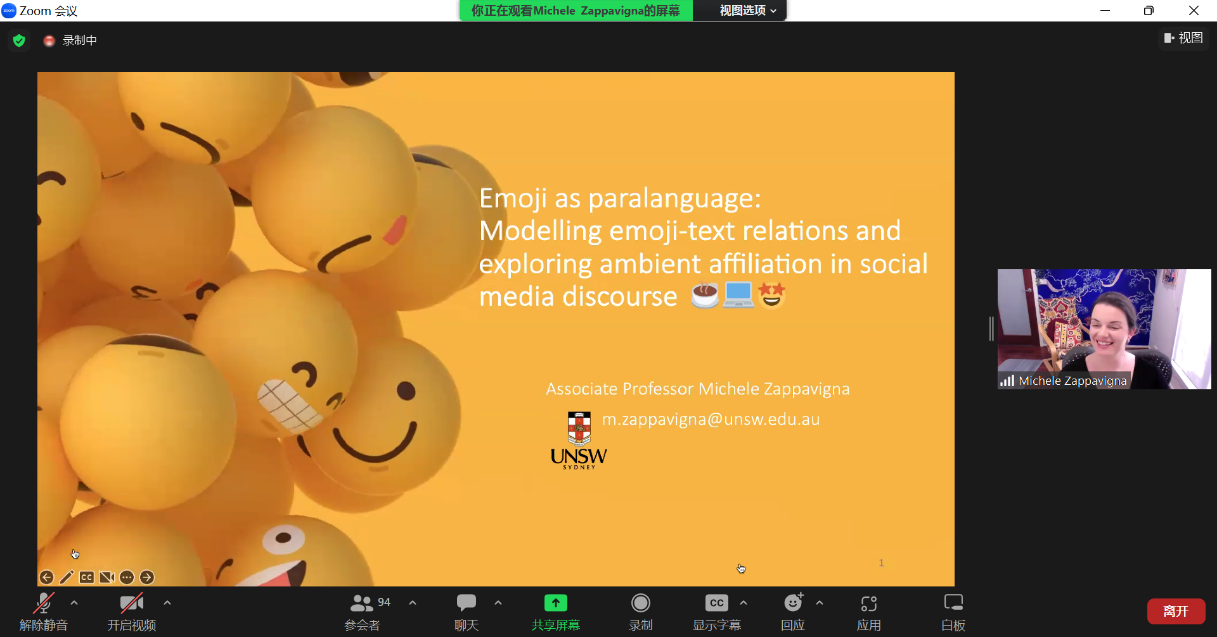 来自悉尼大学的Lorenzo Logi博士展示了他与Michele Zappavigna教授基于表情符使用所提出的理论框架如何应用于表情包等图文字与文本的意义构建。