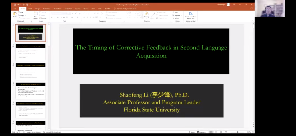 2022年12月13日晚,佛罗里达州立大学李少锋教授带来了一场题为“The Timing of Corrective Feedback in Second Language Acquisition”的讲座。此次讲座为广东外语外贸大学海外名师系列讲座第三场,采用线上腾讯会议模式,讲座由许琪副教授主持,校内外200多位专家学者和师生在线参与了本次讲座。