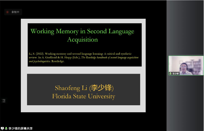 2022年12月16日晚,佛罗里达州立大学李少锋教授带来一场题为“Working Memory in Second Language Acquisition”的讲座。此次讲座为广东外语外贸大学海外名师系列讲座第四场,采用线上腾讯会议的方式,讲座由彭红英博士主持,校内外200余位专家学者和师生在线参加了此次讲座。