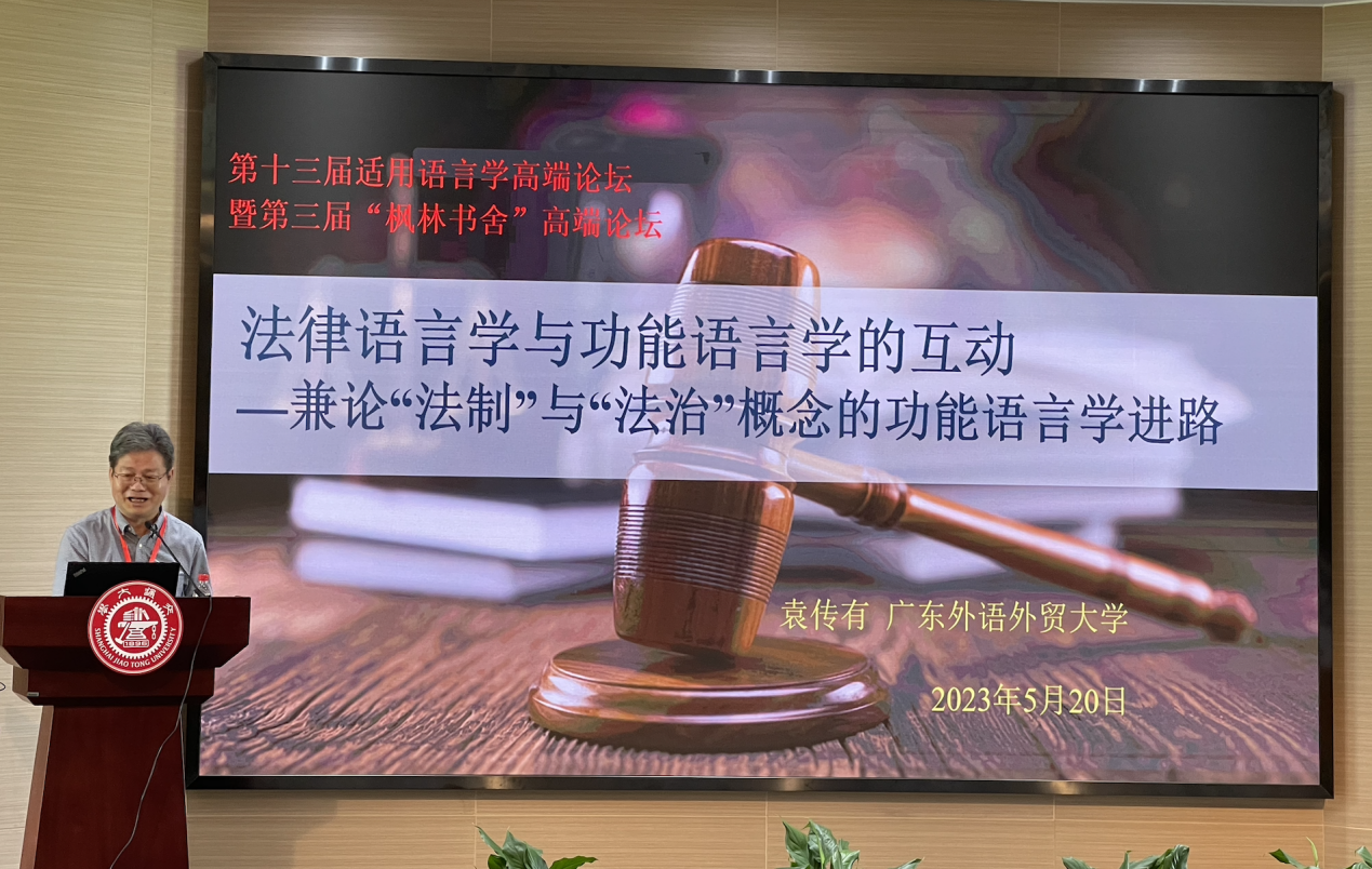 2023年5月20日,我中心研究员袁传有教授带领两名法律语言学方向博士生及十名硕士生前往上海交通大学马丁适用语言学研究中心参加第十三届适用语言学高端论坛暨第三届“枫林书舍”高端论坛。此次会议由上海交通大学马丁适用语言学研究中心和中国英汉语比较研究会法律语言学专业委员会联袂举办。来自国内外适用语言学与法律语言学研究领域的近七十位高校师生以及实务界专业人士参加了此次会议。