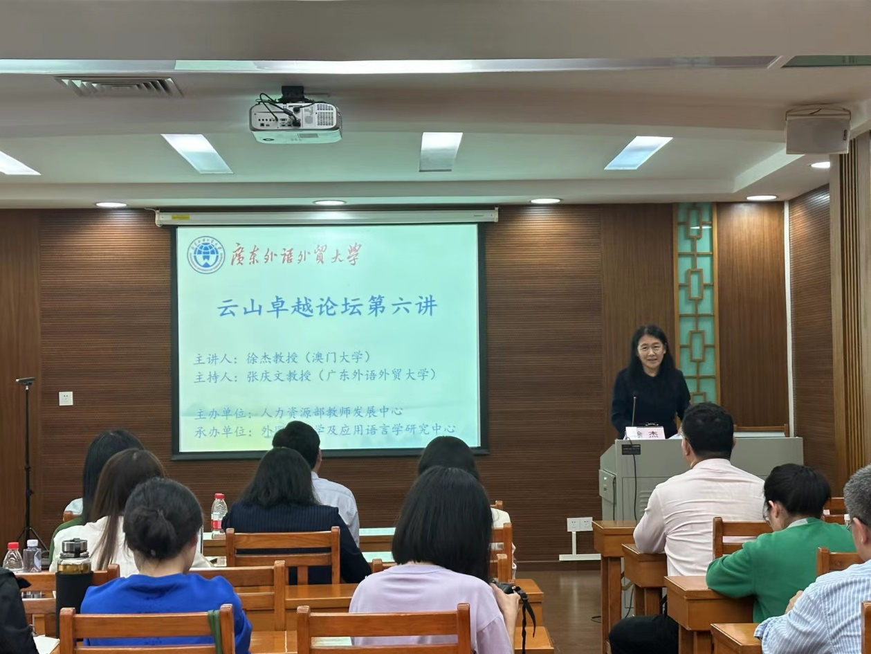 本网讯 10月23日下午,我校教师发展中心主办、外国语言学及应用语言学研究中心承办的“云山卓越讲坛”第六讲成功举行。本次讲坛由徐杰教授主讲,外国语言学及应用语言学研究中心张庆文教授主持。讲坛开始前,教师发展中心副主任董俊武教授和外国语言学及应用语言学研究中心主任赵晨教授分别致欢迎词。