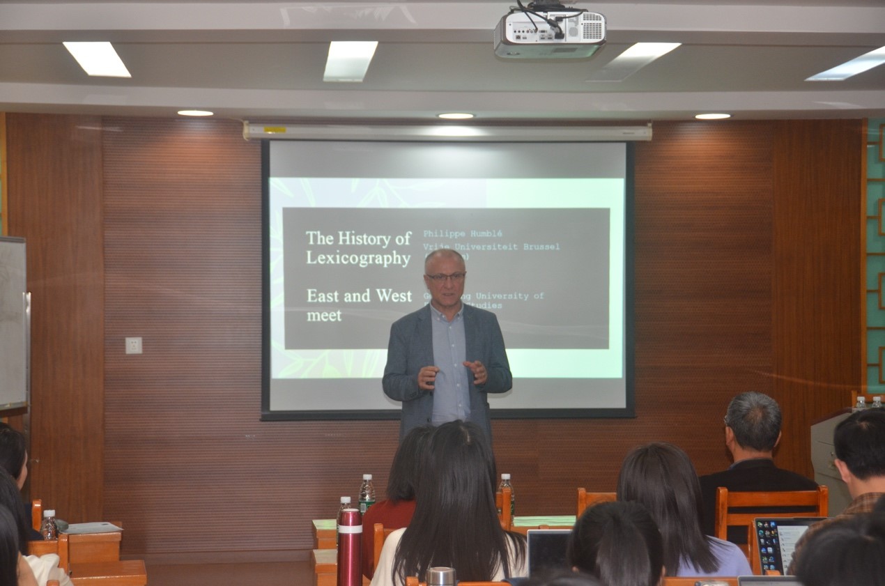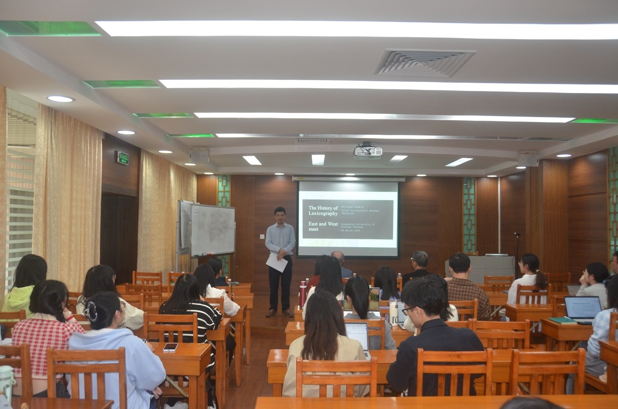 2024年3月22日下午,由广东外语外贸大学人力资源部(教师发展中心)主办、外国语言学及应用语言学研究中心和桂诗春语言高等研究院承办的著名教授论坛第638讲在白云山校区第八教学楼306室顺利举行。本讲座由比利时布鲁塞尔自由大学Philippe Humblé教授主讲,外国语言学及应用语言学研究中心副主任徐海教授主持,田兵教授、袁传有教授、马志刚教授、李茜副教授、黄芳副教授等参加了讲座。讲座主题为“The History of Lexicography: East and West Compared”(辞书史:中西方对比分析)。
