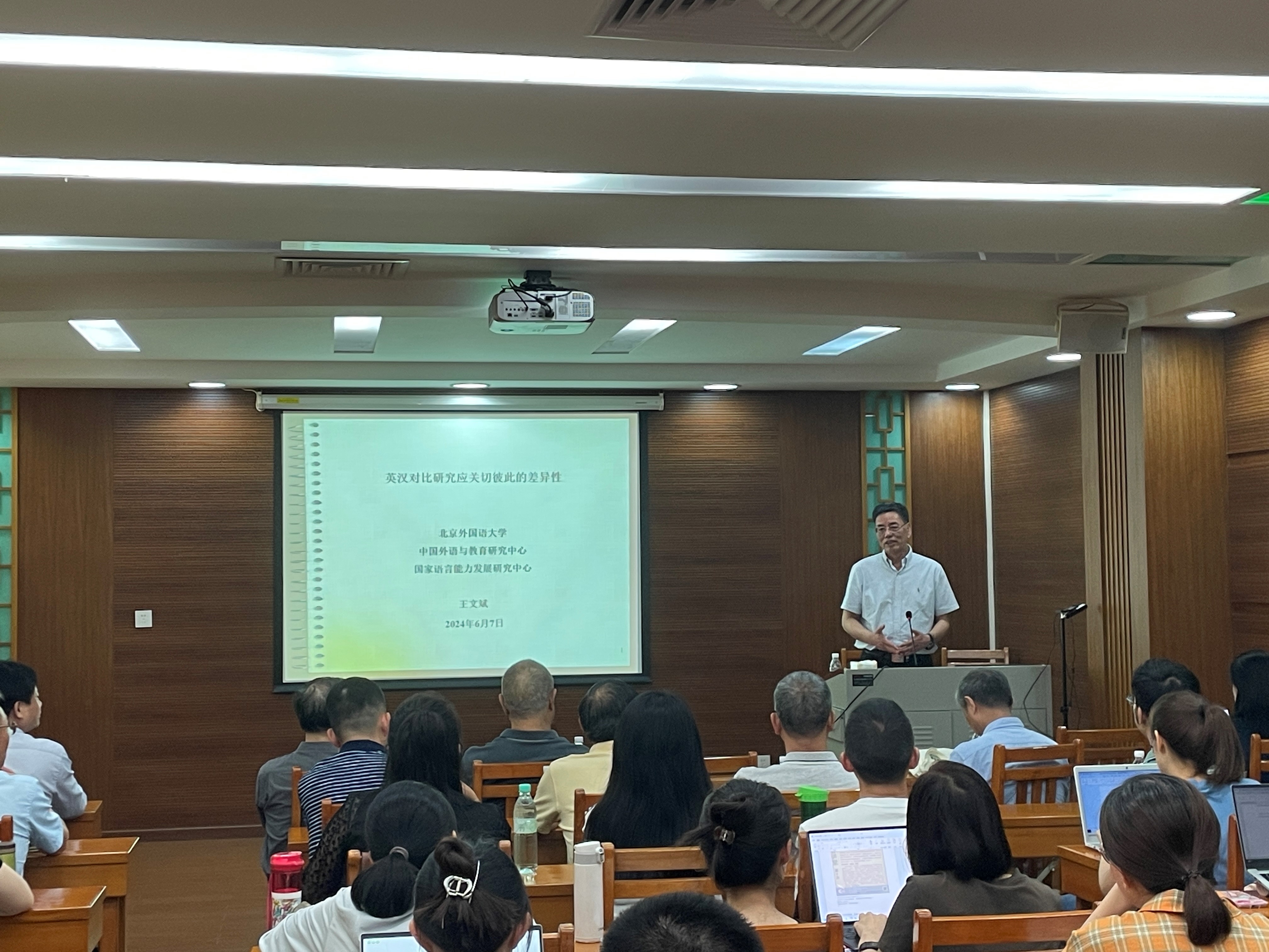 2024年6月7日下午,“桂诗春讲堂”系列讲座第十讲在白云山校区第八教学楼306室举行。本期讲堂特别邀请了北京外国语大学教育部人文社科重点研究基地“中国外语与教育研究中心”主任、博士生导师、著名语言学家王文斌担任主讲,讲题为“英汉对比研究应关切彼此的差异性”。讲座由外国语言学及应用语言学研究中心主任赵晨教授主持,石定栩教授、王初明教授、胡建华教授、冉永平教授、徐海教授、田兵教授、张庆文教授、魏在江教授、董金伟教授、胡春雨教授、秦丽莉教授、梁利娟教授等,以及来自各学院(研究中心)的师生参加了本次讲座。