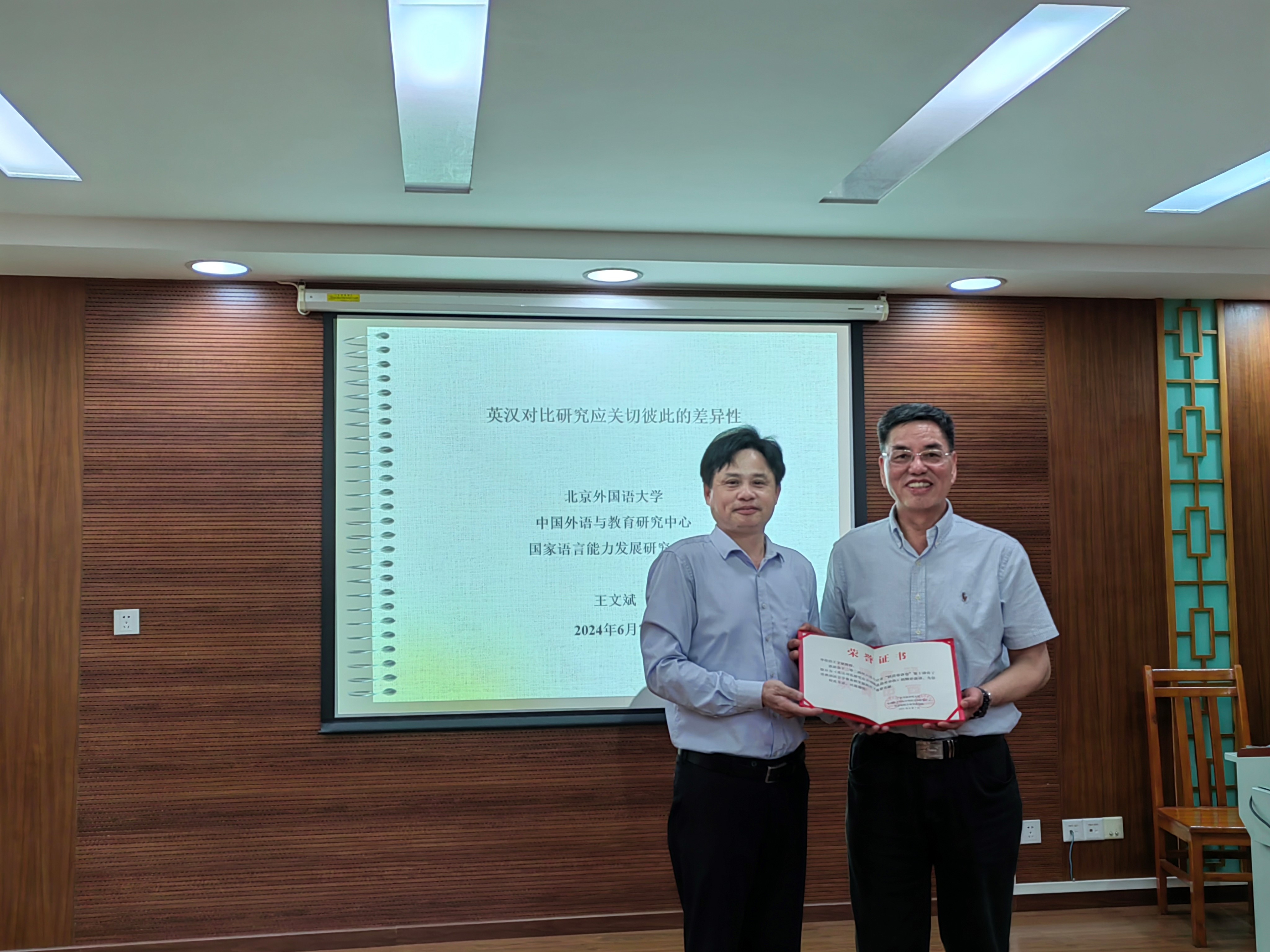 在讲座开始前,外国语言学及应用语言学研究中心主任赵晨为王文斌教授颁发主讲证书,并合影留念。