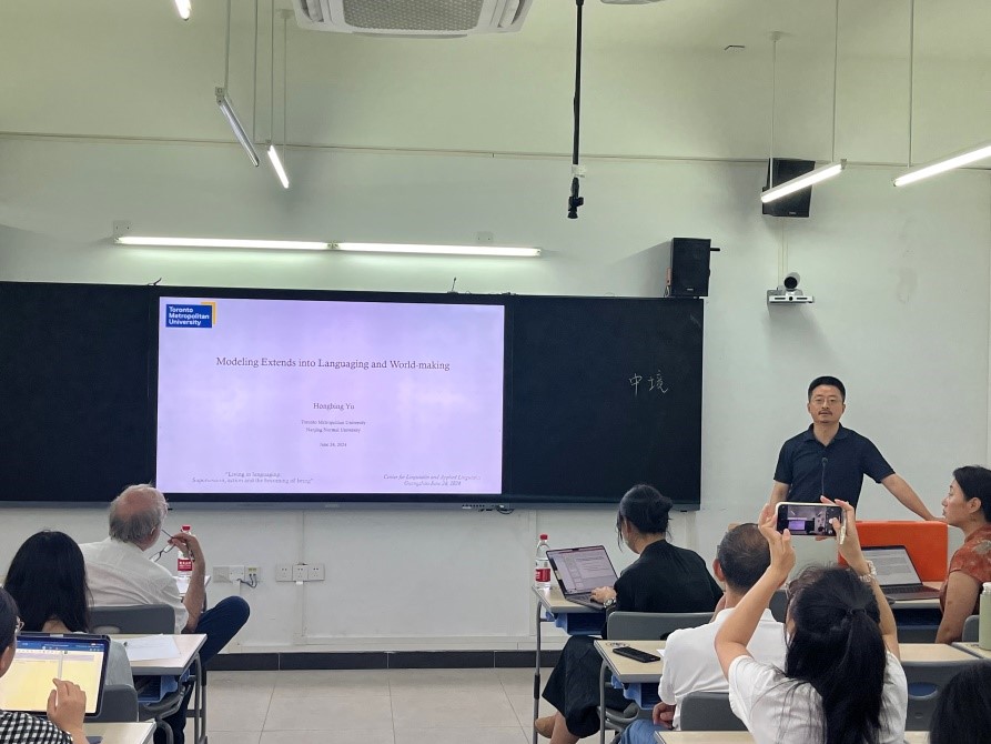 第二场讲座中,余红兵副教授首先肯定了Cowley教授关于言语行动(languaging)的报告,并提出了自己对于“中介世界” (the middle world)的理解。随后,余教授介绍了模型(model)的定义,即模型可以理解为在外部(通过一些物理媒介)被想象或制造的形式,以代表一个物体、事件、感觉等,称为参照物(referent);或代表一类类似或相关物体、事件、感觉等,称为参照域(referential domain)。接着,余教授进一步指出,模型(models)不是符号(signs),而是任何具有显著潜力的意义形式。此外,模型和符号在本质和功能上都有较大区别:模型(models)意味着替代(supersede),而符号(signs)则代表着象征(signify)。余教授还阐述了与符号(semiosis)相结合的建模过程(modeling),并强调了模型的突显性(salience)、易懂性(accessibility)和可操作性(operability)。最后,余教授通过分享自己改良版的皮尔斯符号学三角模型关系图和意义生成三个维度关系图来进一步说明建模和符号之间的关系。改良版的皮尔斯符号学三角模型关系图主要包括意旨(significate)、表征(epresentamen)和阐释(interpretant)三方面。意义生成关系图包括存在维度(existential)、表征维度(representational)和解释维度(interpretational),其中存在维度(existential)属于存在建模(existential modeling),而表征维度(representational)和解释维度(interpretational)则属于符号建模(semiotic modeling)。余教授指出,建模(modeling)和符号(semiosis)既相互交织又相互作用,并在创造和推动意义生成(meaning-generation)的过程中轮流发挥着重要作用。