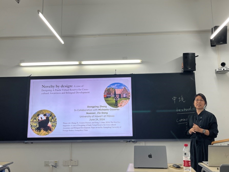 在最后一场讲座中,郑东萍副教授以“Novelty by design: A case of designing a panda virtual reserve for cross-cultural awareness and bilingual development”为题,分享了她们团队关于超语(translanguaging)的跨文化意识和双语发展研究。郑教授首先回顾了Cowley教授关于“新生态语言学”(New Ecolinguisitcs)的报告,并结合生动有趣的例子解释了“超语”的定义和基本内涵。接着,郑教授介绍了García等人在2017年提出的超语模型,包括“立场”(Stance)、“设计”(Design)和“转变”(Shifts)三个重要组成部分。基于该模型,郑教授从设计(Design)的角度出发,结合《孙子兵法》所提出的“布局”(Channeling)理念展开实证探讨。借助实证研究中的有趣发现,郑教授强调布局在超语实践设计中的重要意义,即通过布局,“造成形势”(Creating propensity, powers, situations, events),让语言学习“自发自动”(Agentic)和“持续发挥”(Sustaning)。