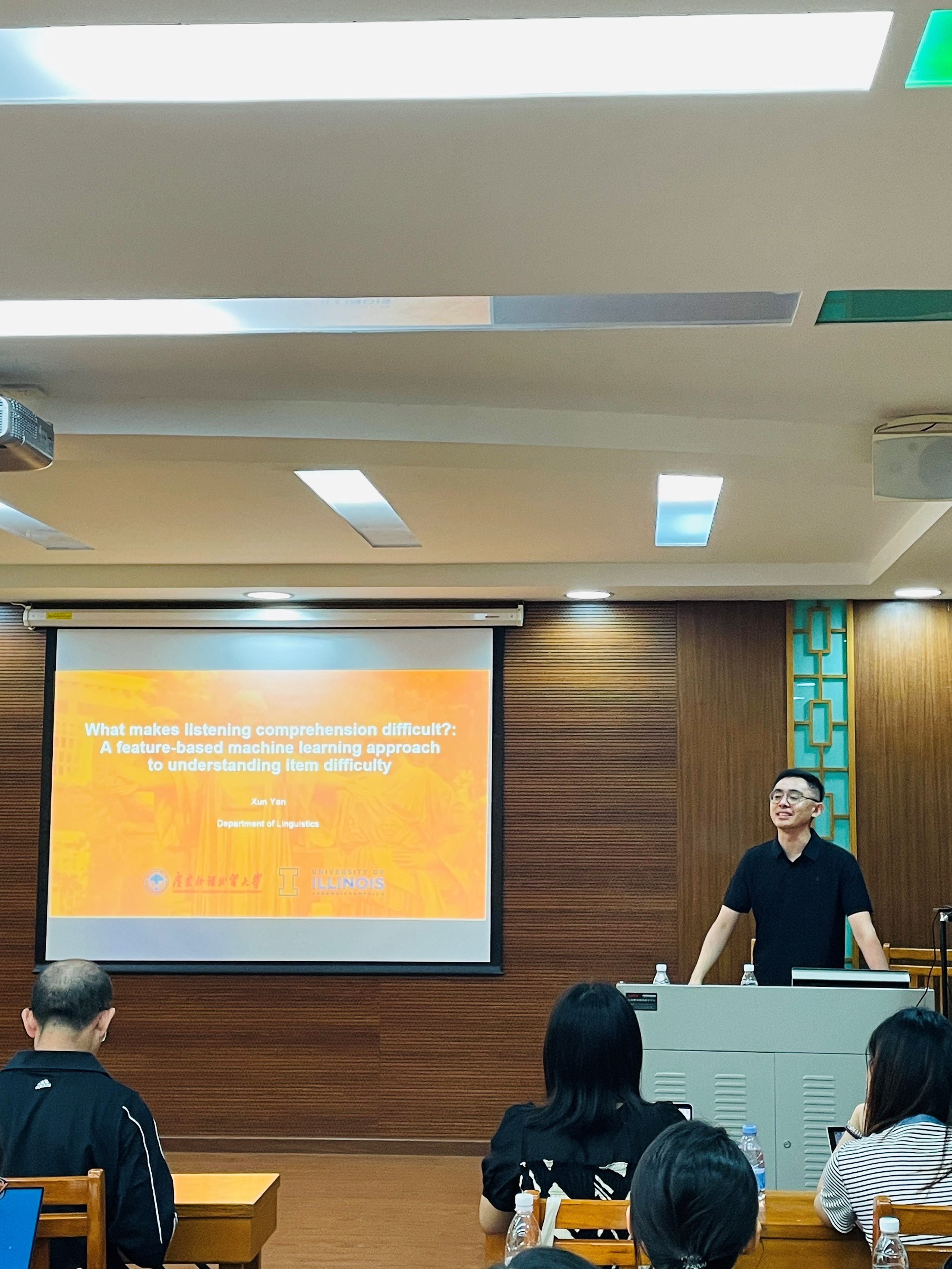 2024年6月28日下午,我校云山讲座教授、美国伊利诺伊大学闫逊副教授在本中心做了题为What makes listening comprehension difficult? A feature-based machine learning approach to understanding item difficulty(听力理解因何困难?用基于特征的机器学习方法理解题目难度)的学术讲座。中心师生和部分兄弟院校的学者聆听了讲座,并与闫逊教授展开了深入的交流。
