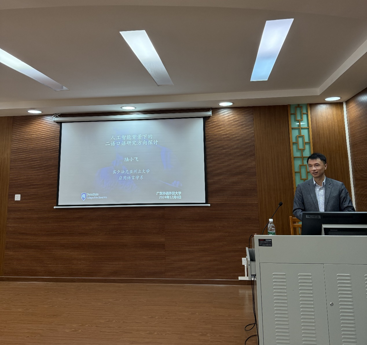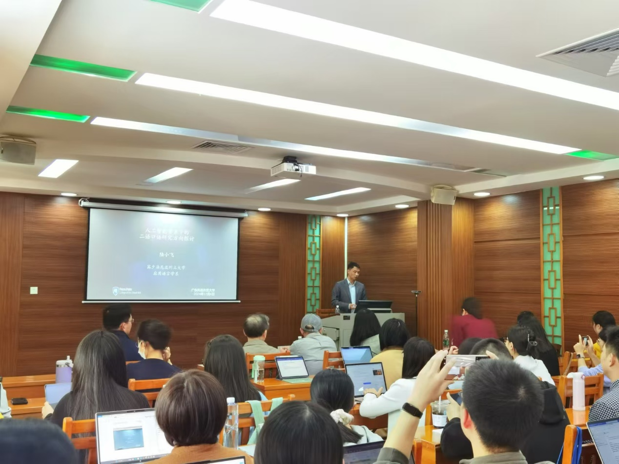 2024年12月6日下午,美国宾夕法尼亚州立大学应用语言学系陆小飞教授应续论研究室邀请,在白云山校区第八教学楼306室做题为《人工智能背景下的二语口语研究方向探讨》的讲座。此次讲座由许琪教授主持,中心王初明教授、徐海教授、熊涛教授、李金辉博士,北京外国语大学杨鲁新教授,续论研究室牛瑞英教授、王启教授、彭红英副教授、胡潇译副教授、张松山博士等校内外师生参加了讲座。