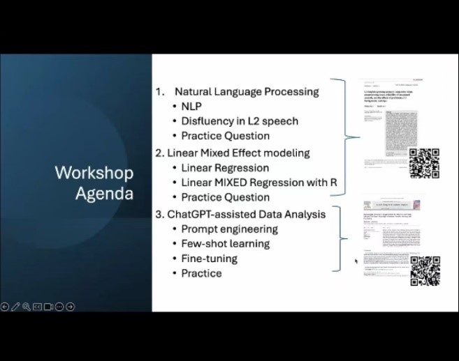 接下来,Kim 博士首先介绍了自然语言处理(NLP)的基本概念,以及其在自然语言理解、翻译、词性标注等任务中的应用。随后,她进一步探讨了二语句法复杂度分析器(L2SCA)在口语语料分析中的应用,并生动地展示了如何通过Python等技术工具实现口语不流畅表达(disfluency)的自动标注。接着,她详细解释了线性混合效应模型(LME)的原理和应用,特别提及其在处理嵌套数据结构时的优势,并展示了如何通过R语言构建LME模型。最后,Kim 博士还详细介绍了ChatGPT辅助的数据分析方法,探讨了如何通过提示语和微调技术来优化GenAI模型,并通过自己的研究实例,向与会者展示了从数据准备到大语言模型微调的全过程。