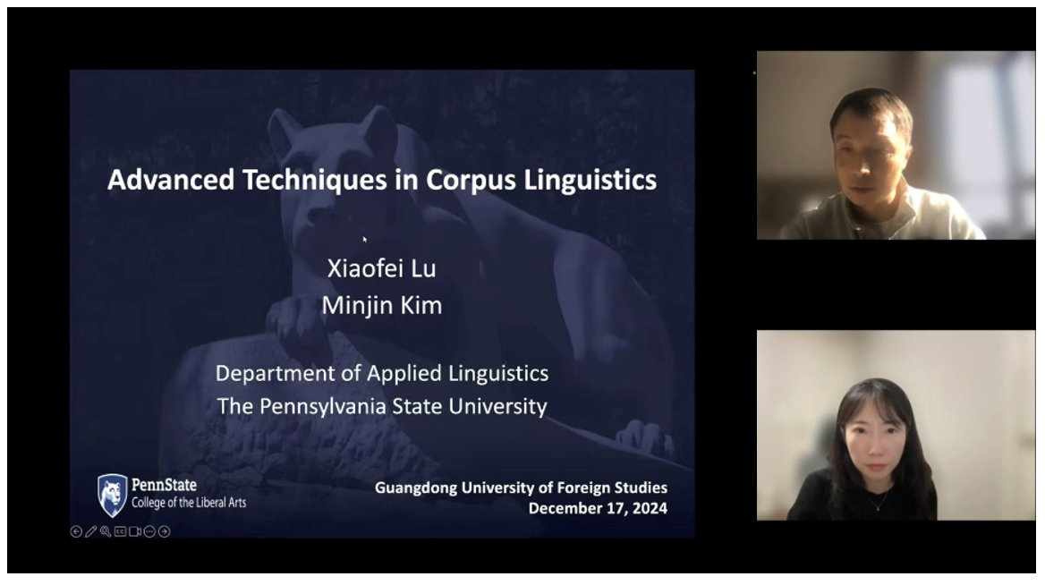 2024年12月17日上午,美国宾夕法尼亚州立大学应用语言学系陆小飞教授与其博士生Minjin Kim应续论研究室邀请,通过ZOOM平台带来了一场题为“Advanced Techniques in Corpus Linguistics”的研究方法工作坊。此次讲座由许琪教授主持,吸引了近200名校内外师生参与。