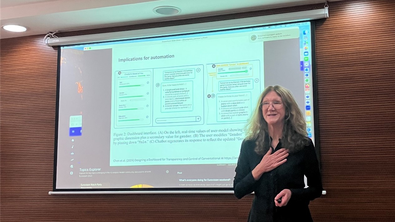 2025年5月27日下午,我中心与桂诗春语言高等研究院承办的广外话语论坛第30讲在白云山校区顺利举行。英国利物浦大学传媒系主任Kay O’Halloran教授应邀在文科基地演示厅做了题为“Multimodal Analysis of Social Media”(社交媒体的多模态分析)的学术讲座。讲座展示了如何运用大语言模型跨平台分析社交媒体的在线内容,并且演示了利用AI工具可视化大数据呈现的多模态规律。讲座由张艺琼教授主持,文科基地徐海教授、袁传有教授及华南理工大学、中山大学等众多校内外师生参与了本次讲座,现场座无虚席。