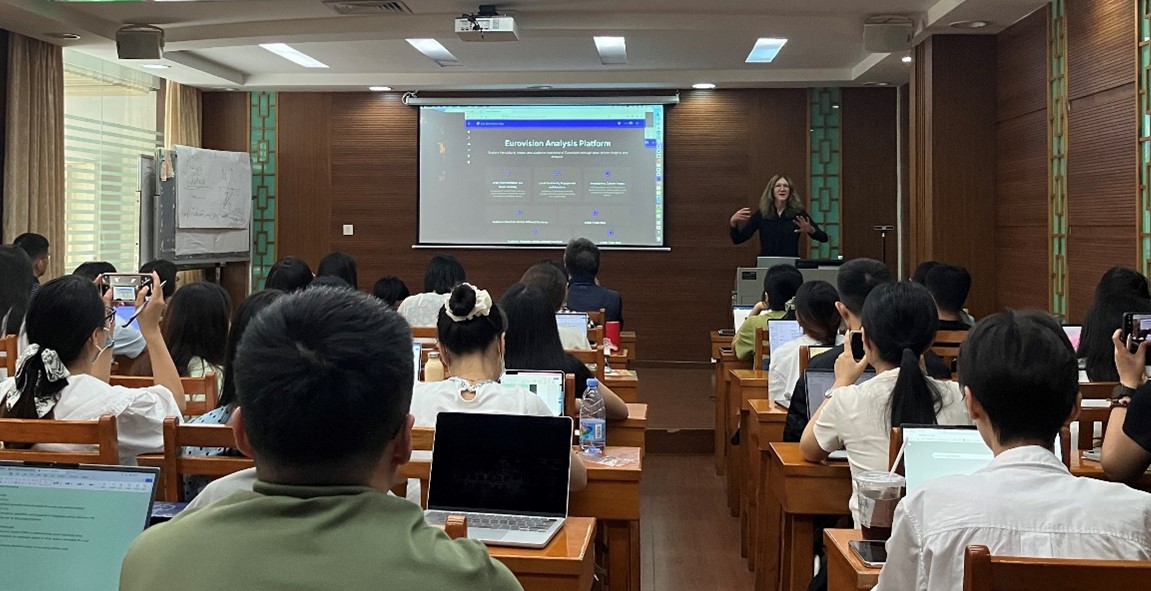 O’Halloran教授从这一基于语境的信息融合方法出发,以选手展示和音乐传播、社区参与及反应、文化影响等主题为焦点,揭示数据驱动下的节目传播及观众反应规律。她展示了其团队开发的元-利物浦平台(Meta-Liverpool Platform),该平台可用于多模态数据分析并实现结果的可视化。研究发现,公众情感、讨论主题和参与规律随着节目关键事件而引发讨论高潮。YouTube等社交媒体起到了引导及助推舆论等作用。讨论主题也涉及到音乐、悲剧及全球议题等广泛文化主题。讲座结束前, O’Halloran教授引导在场听众重新思考AI作为自动化(automation)工具在数字化时代的适用性。她认为鉴于目前AI的“黑箱”特性,基于功能语言学的多模态分析是提升透明度的途径之一。