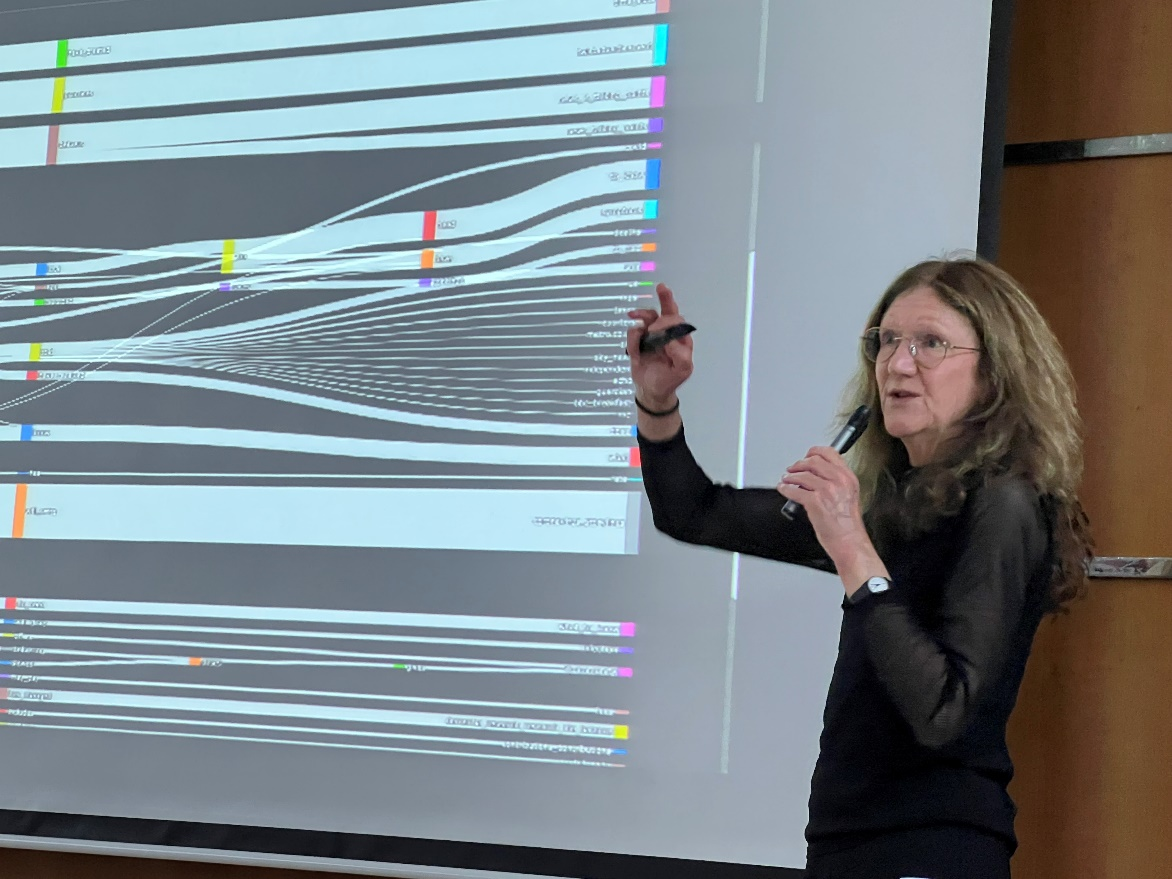 为了帮助听众更直观地理解AI与多模态话语研究的融合,O'Halloran教授从理论与实证两个维度展开论述。理论层面,她介绍了系统功能语言学如何应用于语言、图像与数学符号系统的协同分析,并以特朗普关税政策报道为例,详细演示了多模态语篇分析过程。实证层面,她分享了其在利物浦大学与计算机及社交媒体研究团队合作的疫情信息传播项目。该项目运用自然语言处理、图像识别、情感分析等AI工具,建构交互式数据可视化平台,系统分析政府、新闻媒体与社交平台之间的信息流动与情绪反应。她指出,尽管AI可处理大规模数据,但AI模型往往缺乏语义层次的理解机制,更多是对信号的预测和再现,在语义、语用和文化层面仍然需要人文学科的专业解读。
