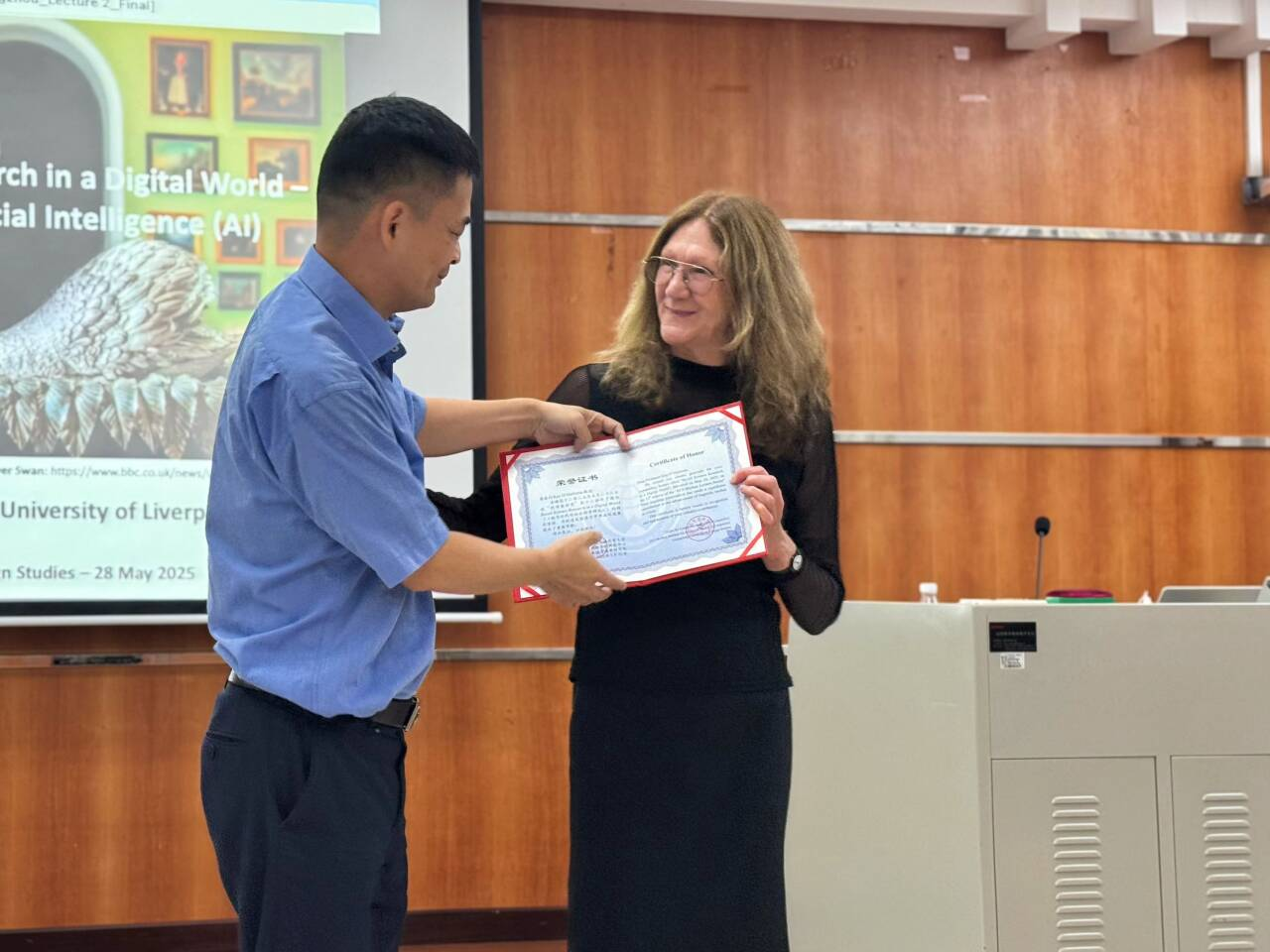 张艺琼教授首先简要回顾了桂诗春教授的学术贡献与桂诗春讲堂的宗旨,并对O’Halloran教授到访中心进行交流表示衷心感谢。随后,徐海教授代表中心向O’Halloran教授颁发讲堂荣誉证书,感谢其为中心带来的学术分享。