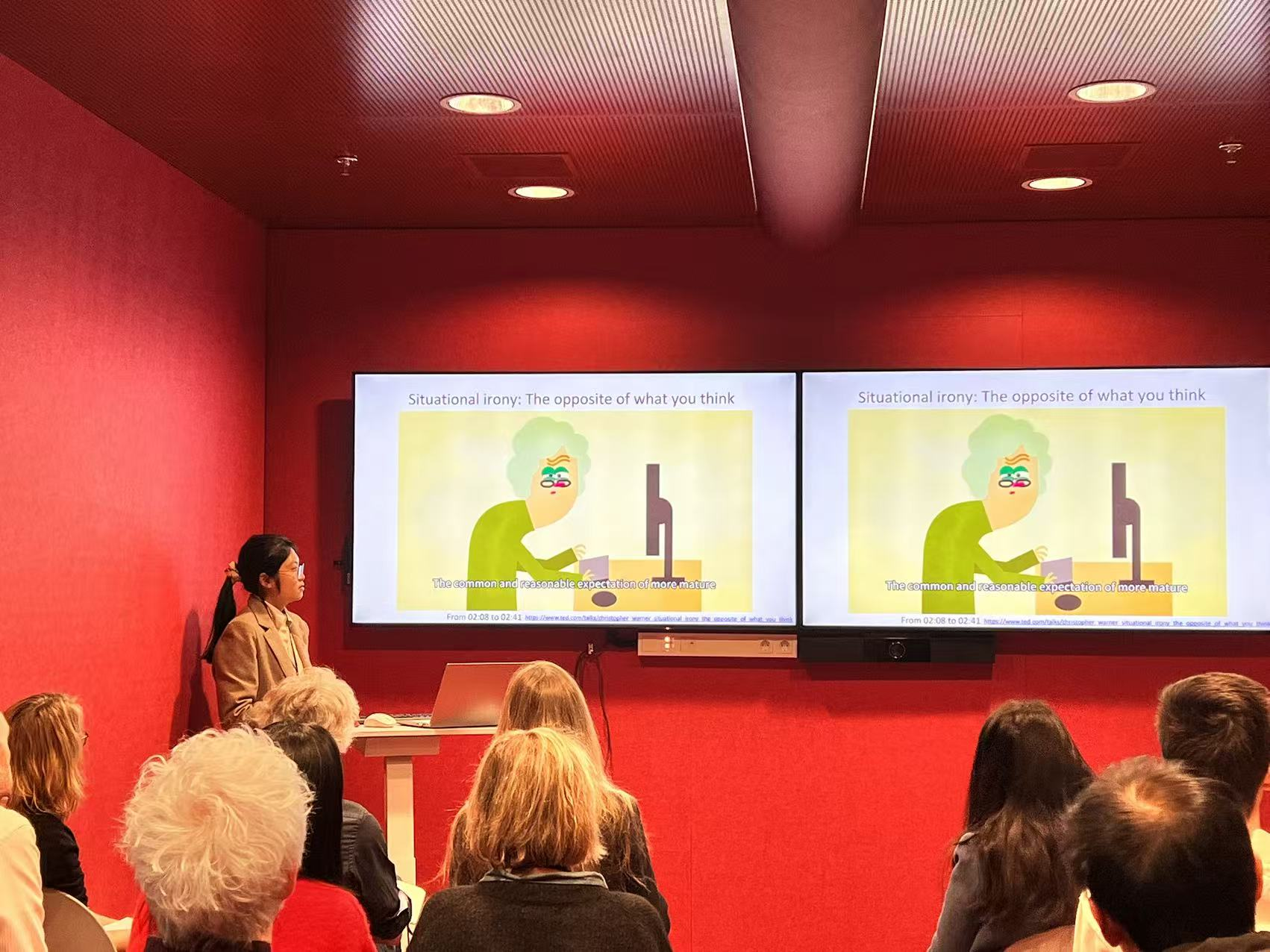 张艺琼教授与硕士生林曦合作,做了题为“Multimodal Argumentation in Humanities and Science Videos: A Comparative Analysis of Argumentation Strategies”的报告,以文科和理科科普视频为例,从图尔敏论证模型和系统功能语言学的角度分析了文理科视频在论证策略中侧重运用视觉和声觉构建意义,发言引起了与会者的热烈讨论。