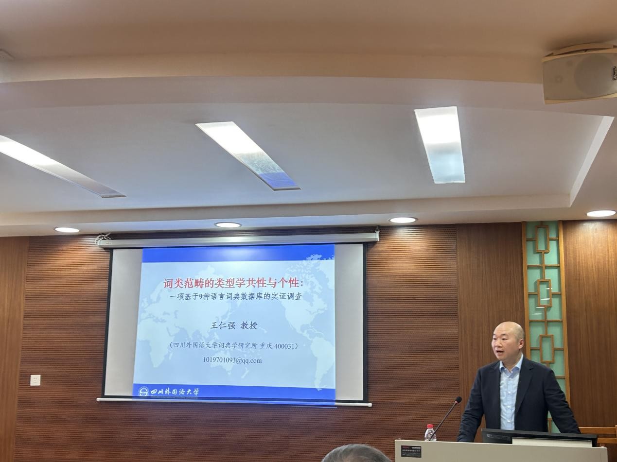王仁强教授的讲座聚焦于其创新理论——“双层词类范畴化”,明确区分了个体词与概括词在词类归属上的不同层次,并基于本体论、逻辑学、认识论与价值论四个维度,系统构建了该理论的方法论体系。该理论为类型学视角下人类语言词类系统的分析提供了崭新的理论框架。随后,王教授展示了其团队基于自建多语种词典数据库所开展的实证研究。该研究通过对英语、汉语、法语等多种语言的词类系统进行数据分析,验证了在印欧、南亚、汉藏及阿尔泰等语系中,普遍存在名词、动词、形容词、副词等基本词类范畴。这项基于词典的大规模语言调查进一步表明,人类语言的词类系统既具有跨语言的共性特征,也体现出各语言特有的个性差异,对词典学与语言类型学研究具有重要的理论参考价值。整场讲座中,王教授以扎实的实证数据与创新的理论体系为支撑,向在场师生生动呈现了词类范畴研究领域的前沿进展。