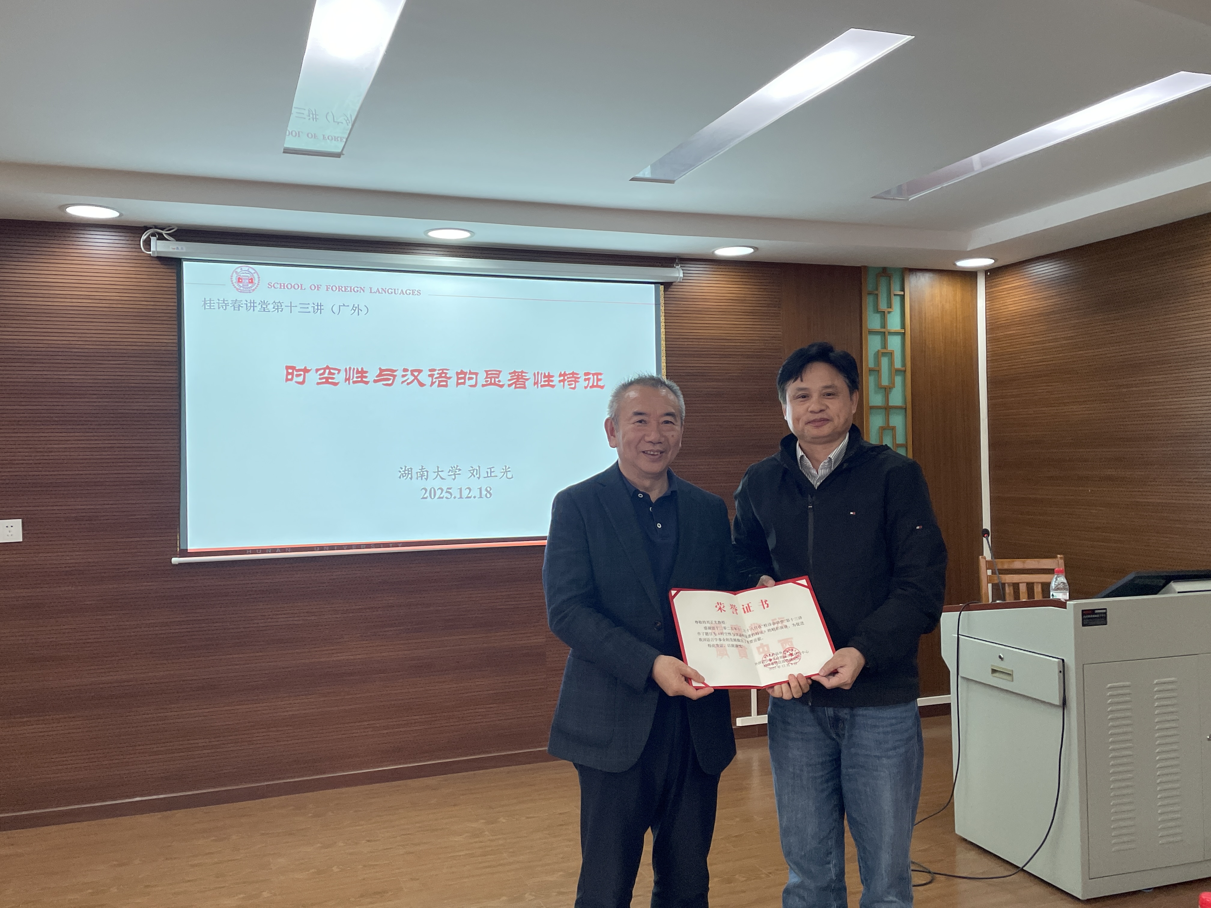 2025年12月18日下午,湖南大学刘正光教授应我中心桂诗春语言高等研究院邀请,在白云山校区八教306室带来了一场题为“时空性与汉语的显著性特征”的专题讲座。讲座由赵晨教授主持,中心冉永平教授、徐海教授、梁利娟教授及校内外众多硕博研究生参与了本次讲座。