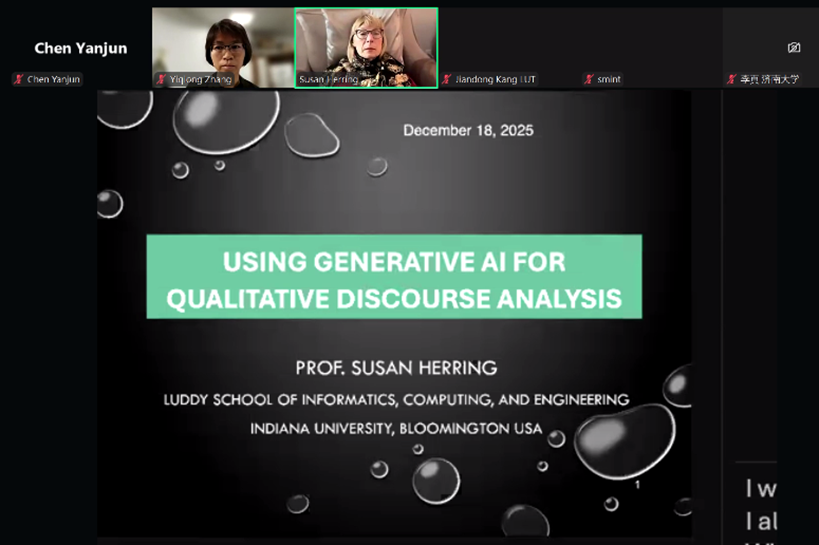 2025年12月19日上午,美国印第安纳大学伯明顿分校卢迪信息学、计算与工程学院的Susan C. Herring教授应我中心邀请在线举行学术讲座,分享其团队利用生成式人工智能展开质性语篇分析的前沿成果。Herring教授是数字语篇研究领域具有开创性影响的著名学者。早在20世纪90年代,她率先将语言学与计算机媒介交流研究相结合,系统提出并发展了计算机媒介语篇分析(Computer Mediated Discourse Analysis, CMDA)的理论框架与分析方法,为理解数字沟通中的语言形式、互动结构与社会意义奠定了基础。她的研究贯穿早期电子邮件、在线论坛到当代社交媒体的人际互动、图像化交流与人工智能等多种数字语境,对数字语篇研究、网络语言学及新媒体语篇研究产生了深远而持续的影响。本次讲座吸引了来自美国、英国、澳大利亚、新加坡、马来西亚、香港及国内三十多所高校400余名师生的参与。