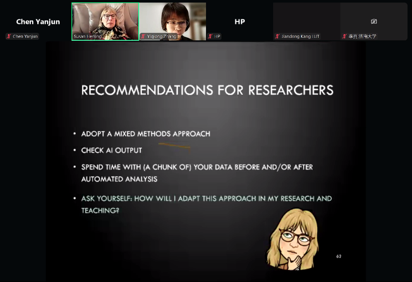 最后,针对研究流程透明度、单人编码情形下的信度保障以及生成式人工智能在教学中的应用前景等问题,Herring 教授强调,无论是否引入人工智能,质性语篇研究都应严格遵循基本的方法论规范。对新手研究者,她建议可通过同伴互评来提升编码信度,或在样本规模较大时采用抽样检验。在教学层面,生成式人工智能适合作为引导学生理解编码决策复杂性、促进其反思分析合理性的辅助工具,而不应被用作提供“标准答案”的替代方案。